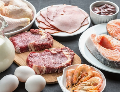 하루 단백질 섭취는 체중 1kg당 약 0.8g 정도가 적정하며, 고기뿐 아니라 달걀, 생선, 콩, 견과류 등 다양한 식품으로 나누어 섭취하는 것이 좋다.